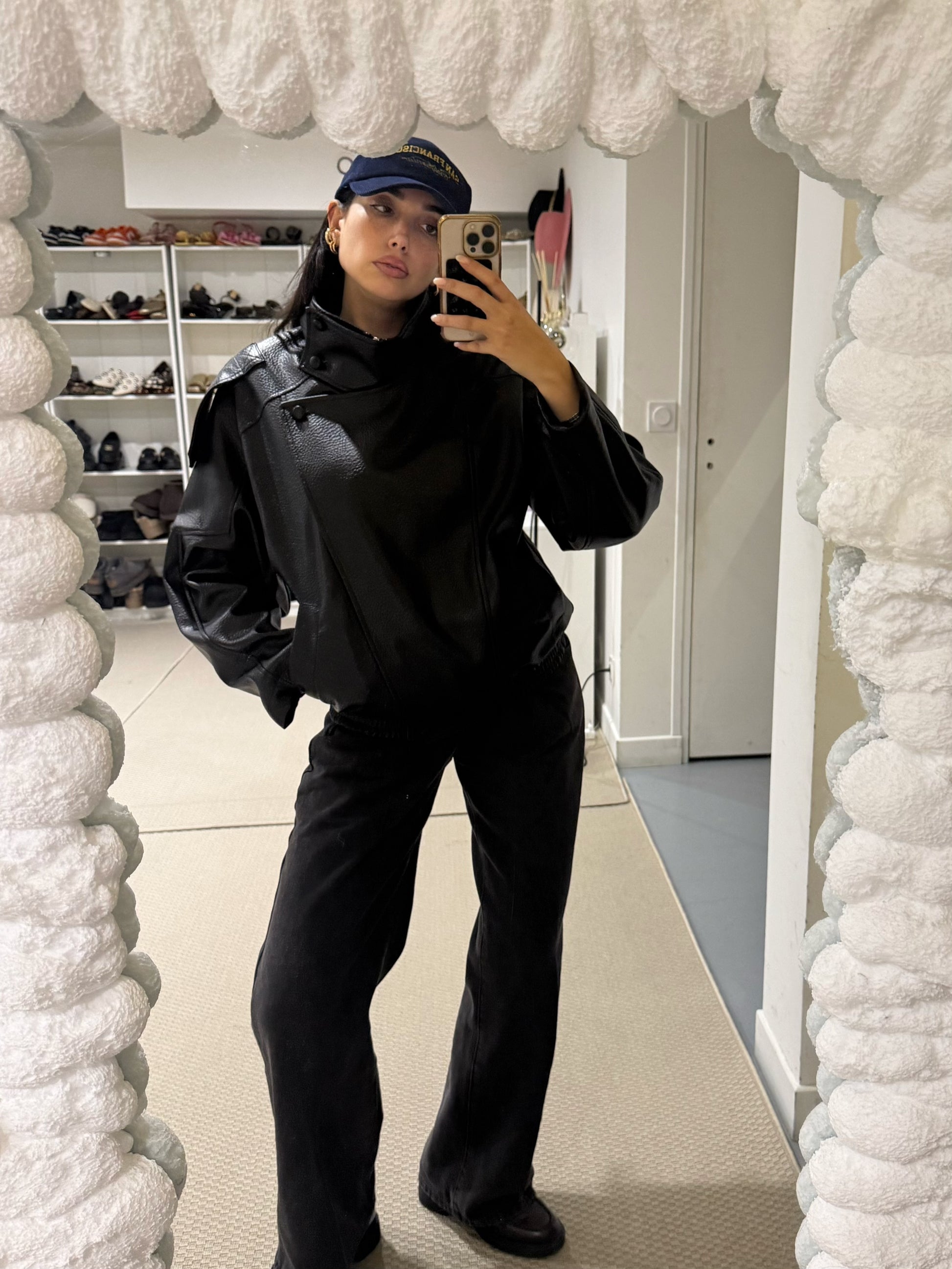 Blouson noir oversize en simili cuir grainé à col montant.