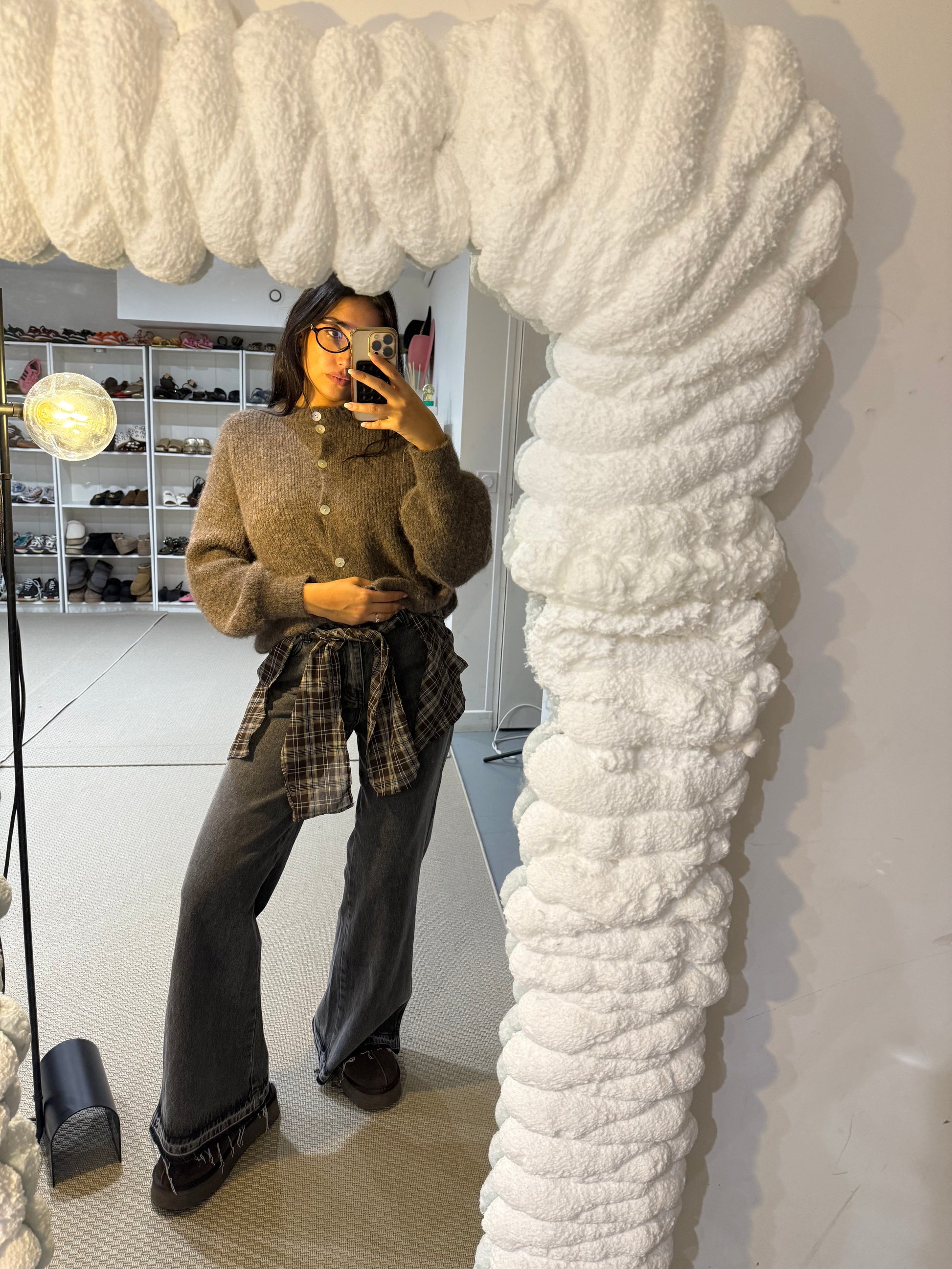 Jean gros anthracite effet used avec ceinture façon chemise à carreaux