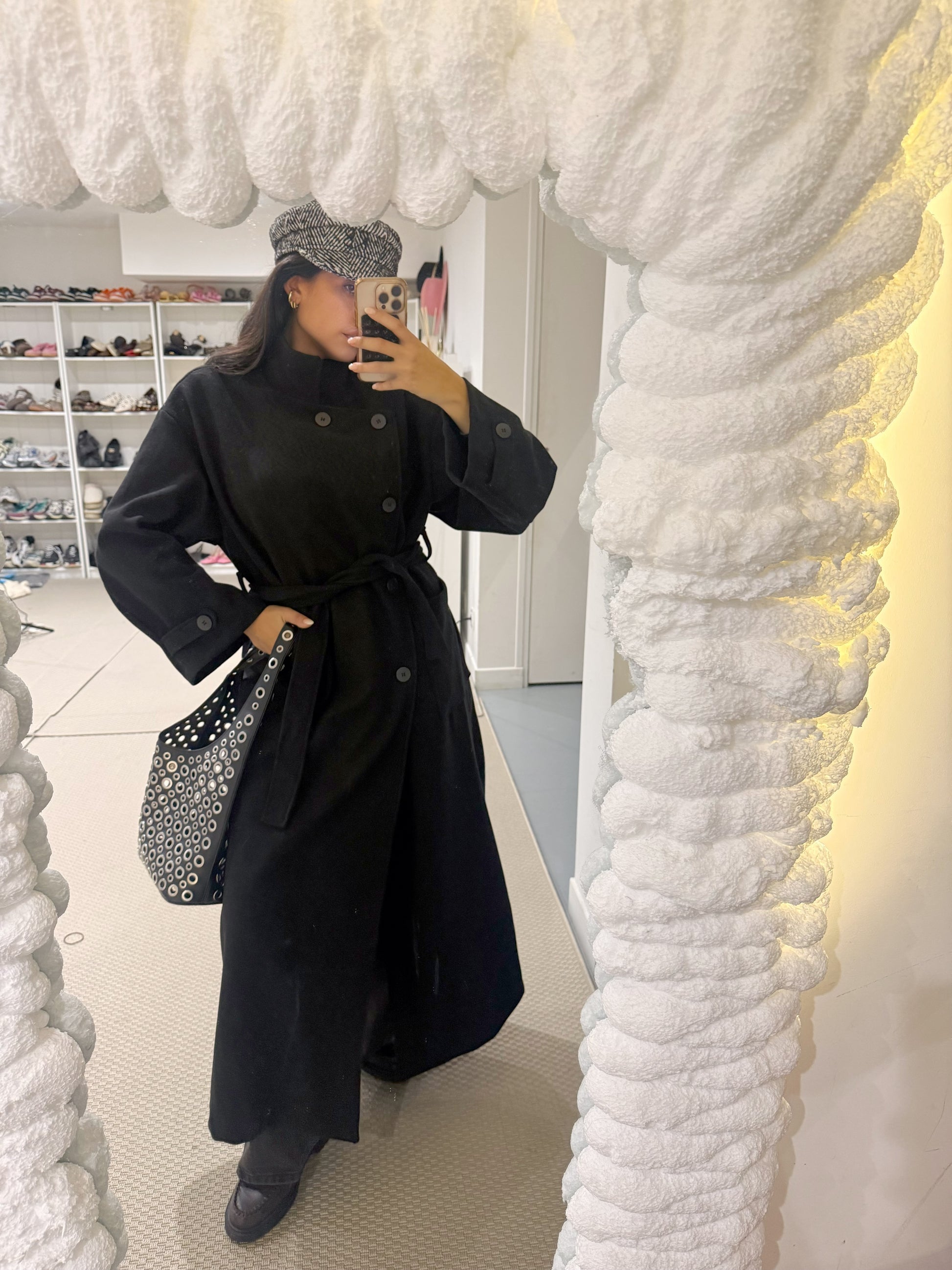 Manteau long à col officier. Peut se porter de 2 manières. Nouage à la taille. Taille unique