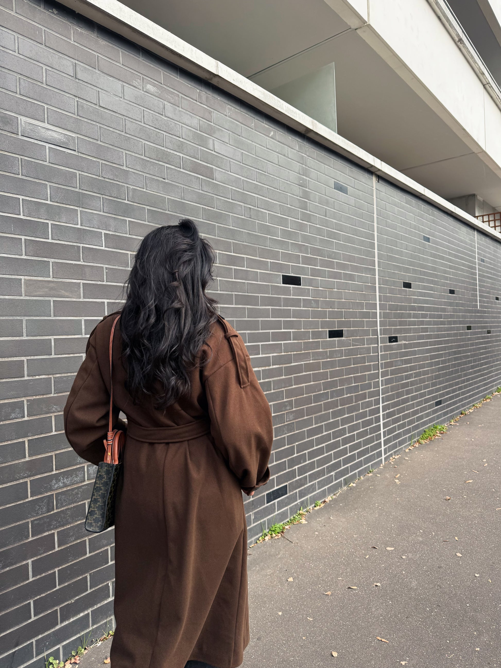 Manteau long taille unique choco avec fermeture croisée et boutonnage. Ceinture de serrage à la taille.