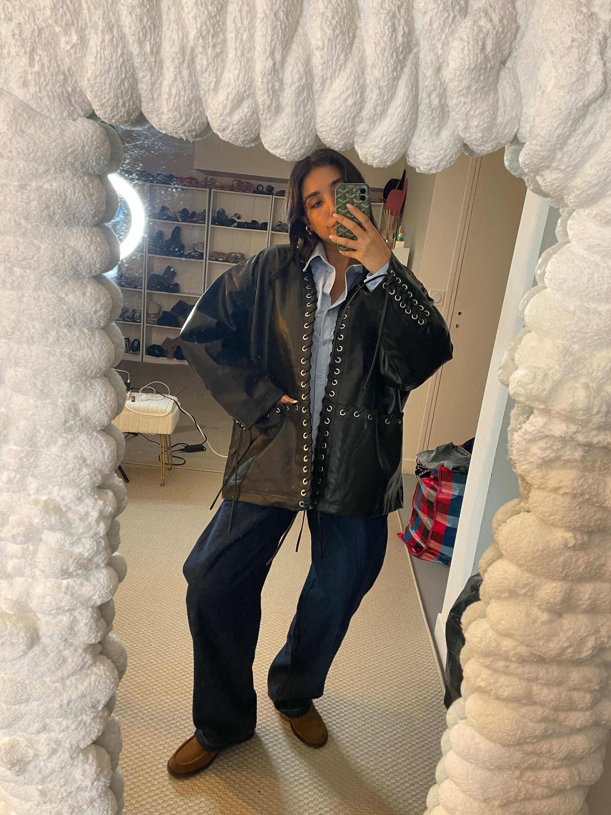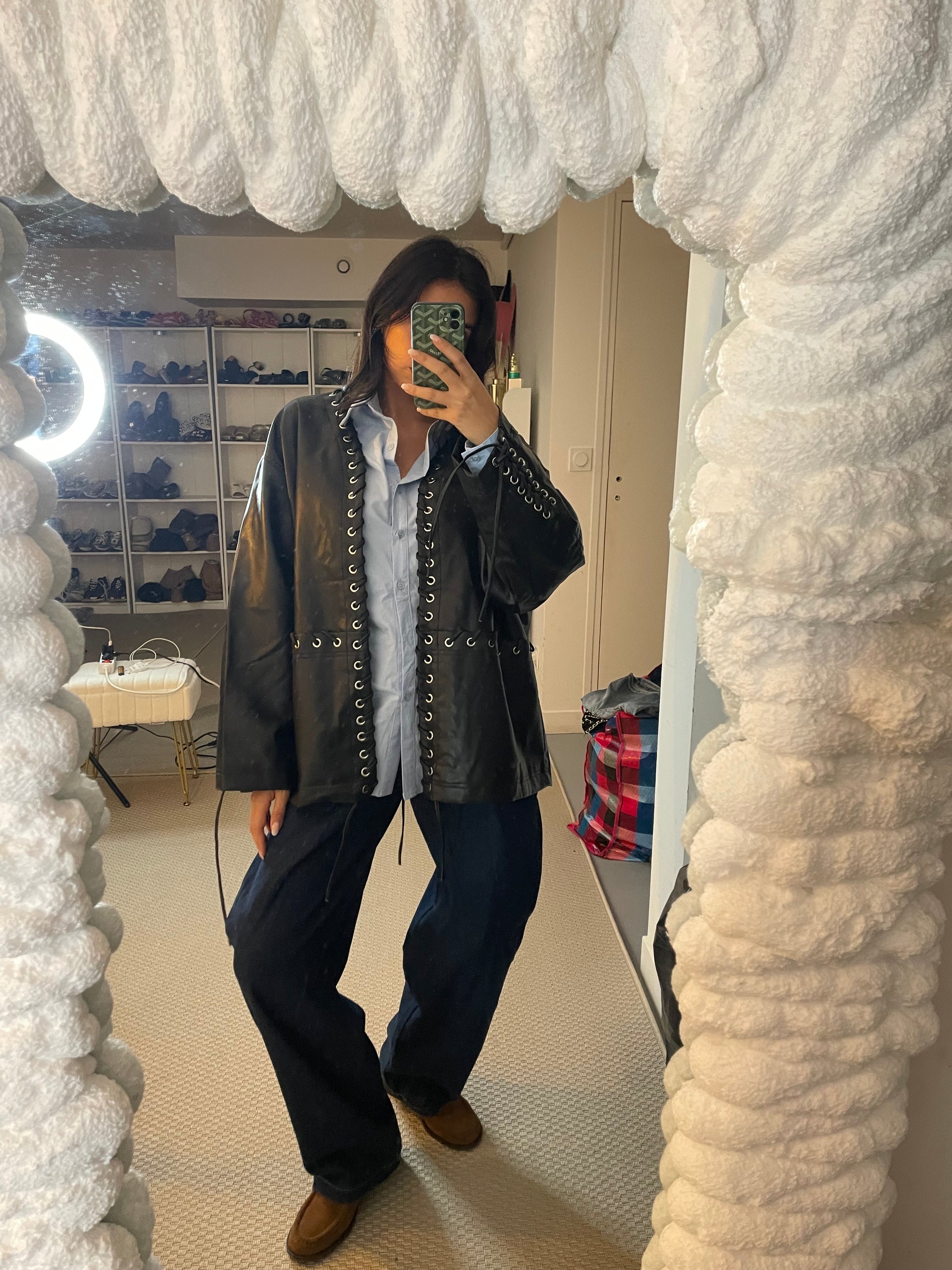 Veste bordeaux en simili cuir à lacets latéraux, sur les poches et au dos. Taille unique